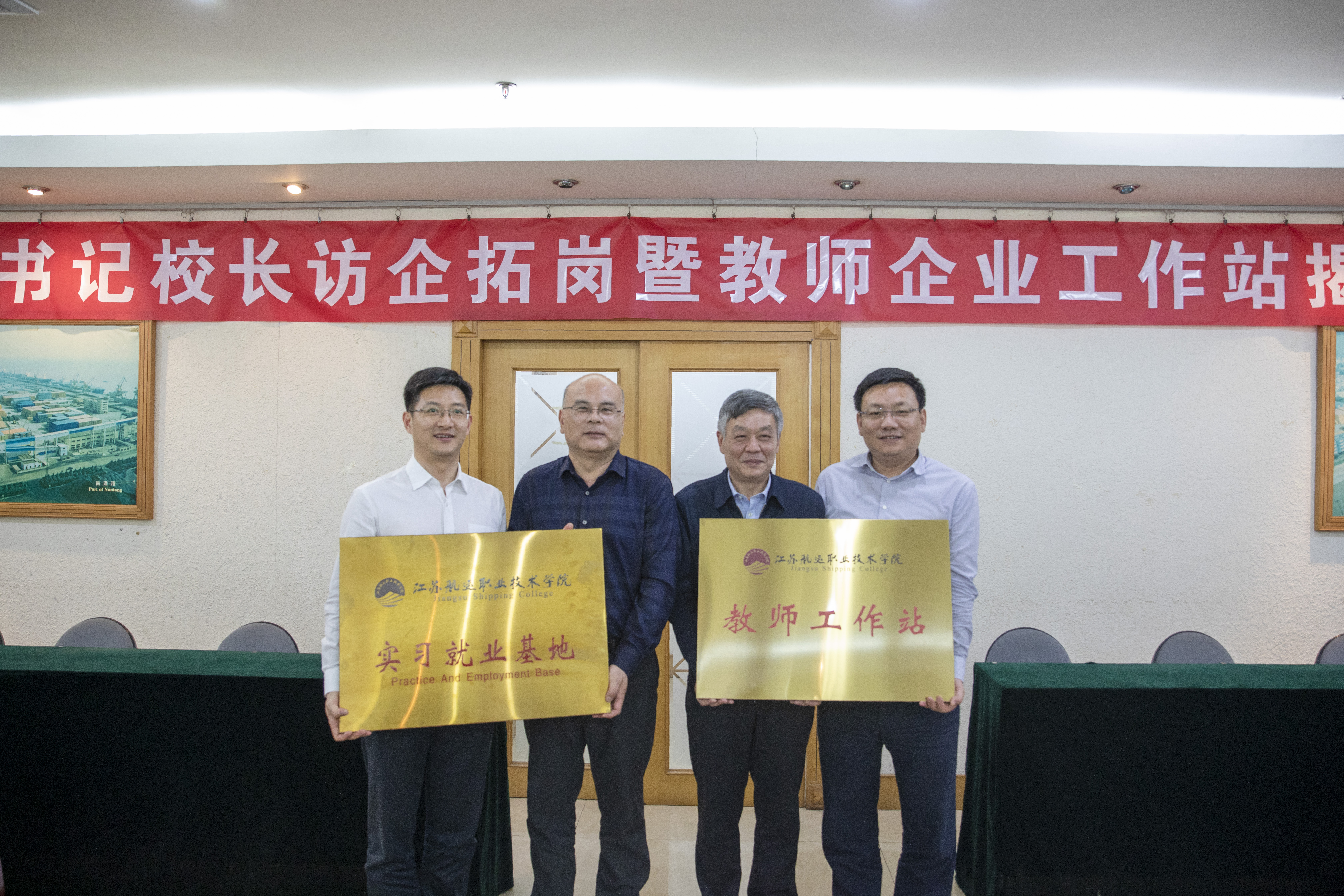 雙方共同觀看了南通港(港口)集團(tuán)有限公司企業(yè)宣傳片。南通港(港口)集團(tuán)與江蘇航運職業(yè)技術(shù)學(xué)院雙方就實習(xí)與就業(yè)基地建設(shè),教師企業(yè)工作站設(shè)立以及校企深度合作等工作進(jìn)行了深入交流。薛揚與朱玉強、施祝斌與劉建分別為校企“教師工作站”“實習(xí)就業(yè)基地”揭牌。